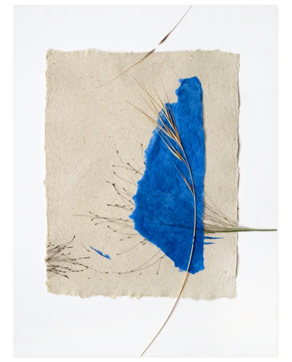 California grasses and blue abaca on handmade wheat straw/cotton paper20 x 24, framed